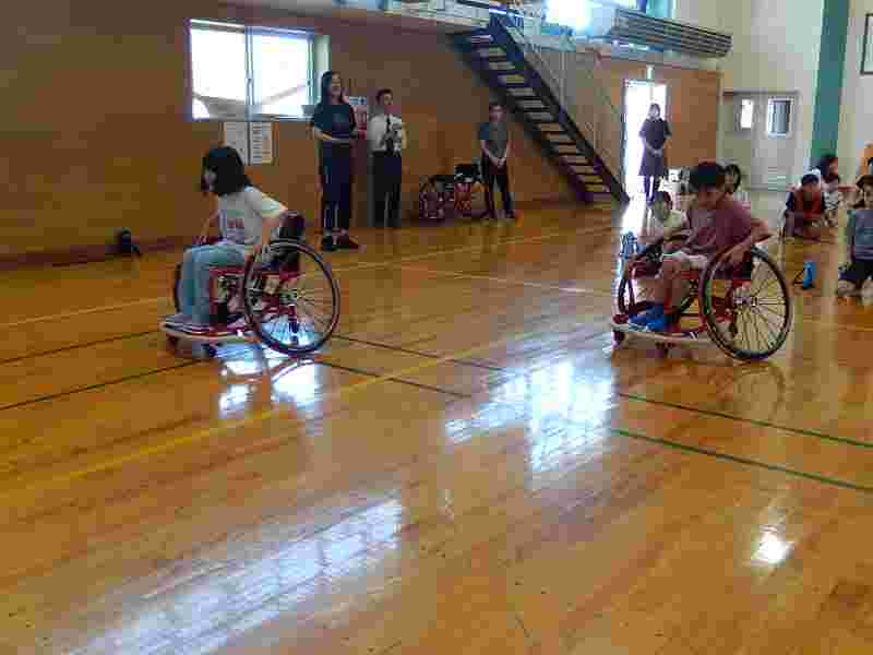 根木さんによる、楽しい会話を交えながらの車いすバスケットボールのデモンストレーションに続いて、全員が競技用車いすに乗って操縦する体験をしました。高学年の代表10名による、車いすバスケットボールの試合も行われました。