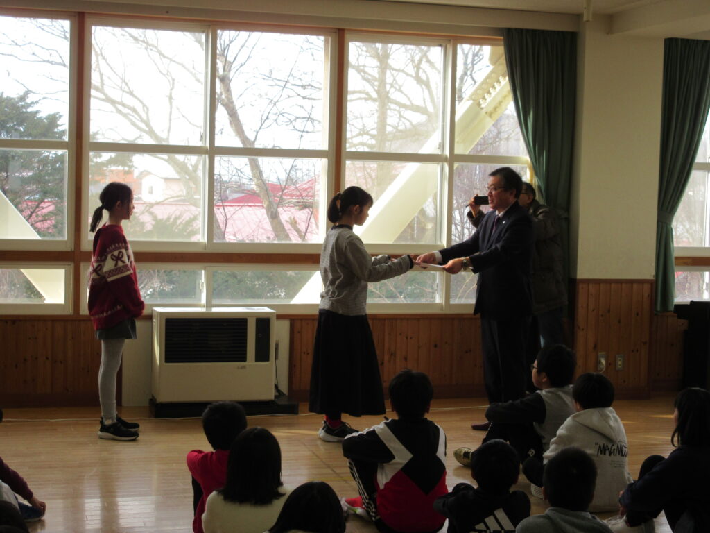 12月25日(木)終業式の中で、標記の表彰式を行いました。全国水土里ネット都道府県水土里ネット主催「未来につなごう!ふるさとの水土里子どもの絵画展」に本校5年生児童が応募をしました。そのうちの2名が佳作とうらかわ理事長賞に選んでもらうことができました。全国2625点の中から選ばれたということで、水土里ネットうらかわの参事さんからすばらしいことですとお褒めの言葉をいただきました。本当におめでとうございます!