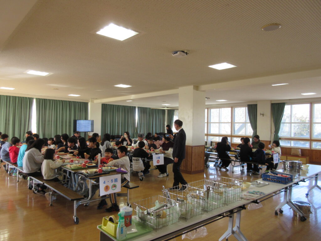 2月25日(水)全校給食を行いました。これは、全校の仲が深まるようにと企画されたものです。縦割り班ごとに座り、給食を食べました。和気藹々と食べる姿が見られよかったです。5・6年生が給食の準備を素早くしてくれ頼もしかったです。ありがとうございます。
