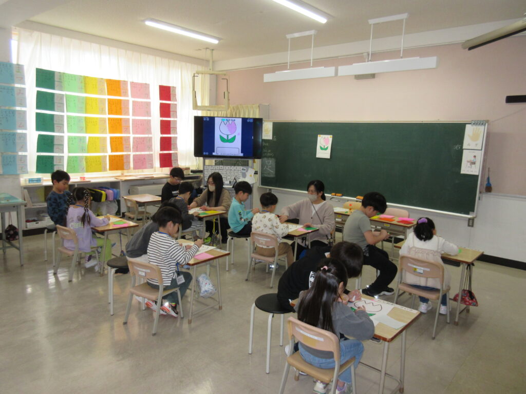 2月2日(月)、午後より新入学児童1日入学を行いました。保護者の皆様には、入学してからの学校生活について説明をさせていただきました。新入学児童については、現1年生と一緒に1年生教室で作品作りをしてもらいました。折り紙を使ったチューリップのちぎり絵を作成しました。新入学児童のために、一生懸命折り紙を千切ってあげる姿は素晴らしく、立派なお兄さん、お姉さんに見えました。早く終わったペアは1年生が絵本の読み聞かせをしてあげる姿も見られました。新入学児童も話をしっかり聞いて、一生懸命作業してちぎり絵を作成する姿が見られとても良かったです。4月に入学してくる日を楽しみに待っています。