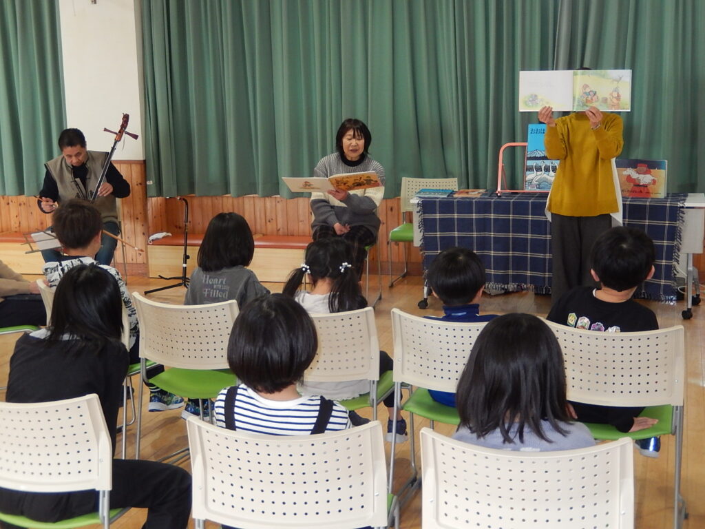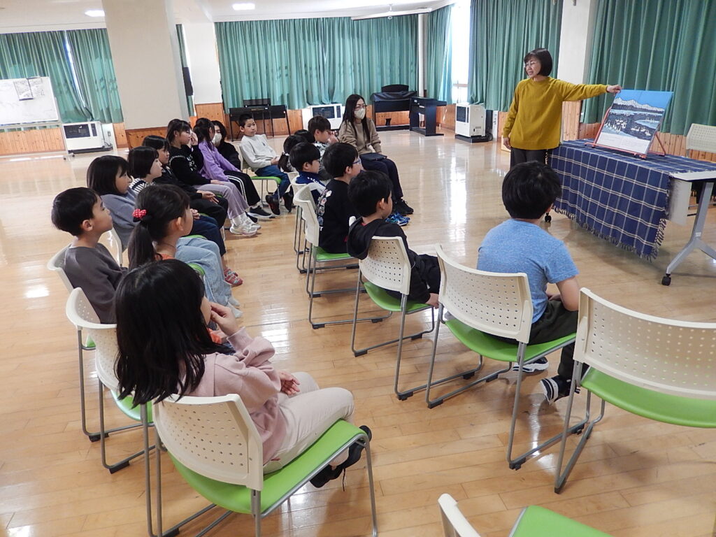 毎月1回、1・2年生を対象に、おはなしサークル「かくれんぼ」の皆さんによるおはなし会が行われています。今回で、今年度のおはなし会は終了となりました。最後のおはなし会では、毎年恒例となっている「馬頭琴(ばとうきん)」の音色をバックにした読み聞かせをしてくださいました。馬頭琴は、モンゴルの伝統的な弦楽器で、先端に馬の頭の彫刻が施されているのが特徴です。 今回は、「天馬ジョノン・ハル~モンゴル馬頭琴ものがたり」の読み聞かせが行われ、子どもたちは馬頭琴の美しい音色とともに物語の世界へと引き込まれていました。1年間、心温まるおはなし会を開いてくださった「かくれんぼ」の皆さんに、心より感謝申し上げます。