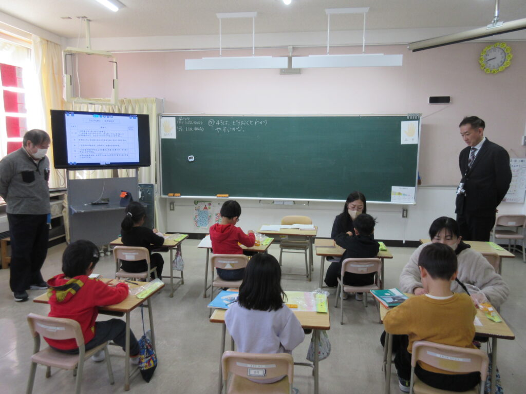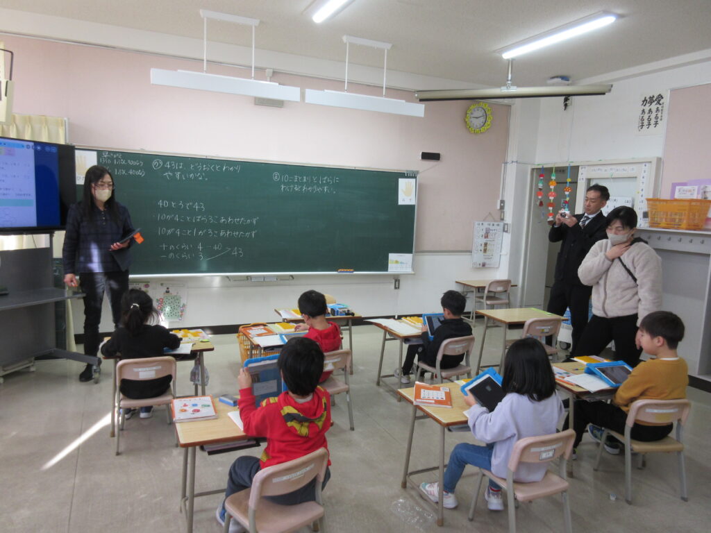 校内授業研究公開で、1年生が算数の授業を公開しました。「大きな数」の単元の授業でした。「43は、どうおくとわかりやすいかな」との課題に1年生が取り組みました。それぞれ、タイルを使って実際に置いて考えました。置いたタイルの写真を一人ずつ撮り、先生に送って、教室の大型テレビに映して確認しました。1年生でも写真を撮り、データを送ることができていて素晴らしかったです。テレビを見て、10個のまとまりをつくると数えやすいことに気づくことができました。43の表し方を言葉でも考えました。10が4こ、1が3こ→40と3で43と言葉で書くことができていました。課題に一生懸命取り組む姿が見られよかったです。